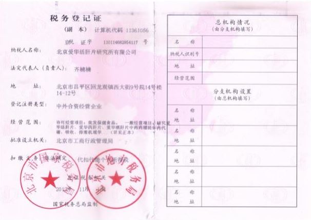 北京愛華活肝片研究所有限公司 稅務(wù)登記證