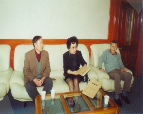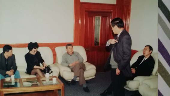 1997年闊別二十年后齊愛華教授回到母校遼寧中醫(yī)學院與遼寧衛(wèi)生廳廳長(右)、遼寧中醫(yī)學院黨委書記(左)親切交談