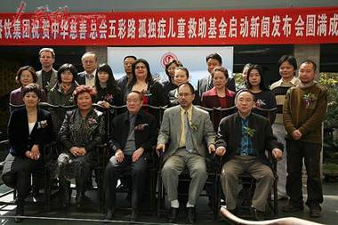 2009年4月2日第二個“世界孤獨癥關(guān)愛日”,“中華慈善總會五彩路孤獨癥兒童救助基金”啟動儀式上齊愛華教授(前排左2)與領(lǐng)導及嘉賓合影