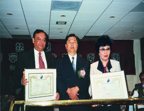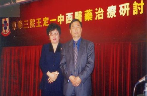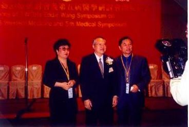 齊愛華教授在國際肝病研討會上與原衛(wèi)生部副部長(中)和遼寧中醫(yī)學院院長袁家麟(右)合影