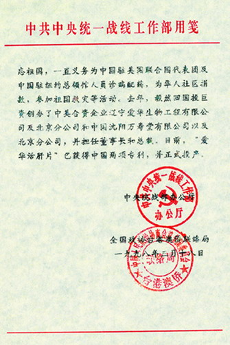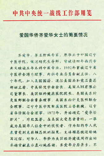 齊愛華,著名肝病專家,原畢業(yè)于中國遼寧中醫(yī)學院,做過研究生導師,曾就讀四年西藥專業(yè)又續(xù)讀五年本科中醫(yī)專業(yè),1992年曾被遼寧省中醫(yī)學會聘為理事、內科專業(yè)委員會副主任。八十年代,加入美國國籍。現(xiàn)任美國共和黨亞裔總部副主席、中美保健學會會長、美國AH有限公司董事長、美國紐約健康醫(yī)院院長、美國美東針灸醫(yī)師聯(lián)合會常務理事、美國東西針灸醫(yī)師聯(lián)合會理事、遼寧中醫(yī)學院附屬醫(yī)院名譽教授、遼寧省華僑聯(lián)合會理事。1972年開始研究“愛華活肝片”,療效顯著,在美國大受患者青睞,一舉成為美國華人社會中的佼佼者。作為紐約華人代表曾受到克林頓總統(tǒng)的接見,克林頓總統(tǒng)還給她寫過信,對華人、華僑為美國經(jīng)濟建設所做出的卓越貢獻表示忠新的感謝。齊愛華身居異鄉(xiāng),不望祖國,一直為中國駐美國聯(lián)合國代表團及中國駐紐約總領館人員診病配藥,為華人社區(qū)捐款,參加祖國救災等活動。去年,毅然回國投巨資創(chuàng)辦了中美合資企業(yè)遼寧愛華生物工程有限公司及北京分公司和中國沈陽萬壽堂有限公司以及北京分公司,并擔任董事長和總裁。目前,“愛華活肝片”已獲得中國兩項專利,并正式投產(chǎn)。